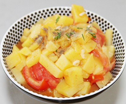 食材:土豆1个、番茄1个、大蒜4瓣、香菜少许、盐1/2茶匙3克。做法:将番茄、土豆、大蒜去皮切块备用。锅中倒入油大火加热,待油4成热时放入一半的大蒜片。煸炒出香味后,放入土豆片翻炒,再放入番茄块,炒到番茄变软出汤后,放入盐翻炒均匀。关火后放入香菜段,和另一半的大蒜片翻炒几下出锅即可。