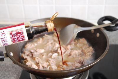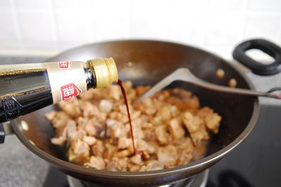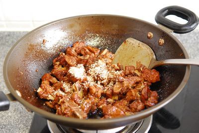 7、锅内汤汁收至剩三分之一时,插手添丁甜醋,保持大火,不竭翻炒。