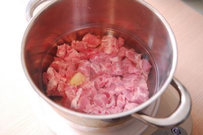 2、排骨凉水入锅,加生姜煮开约一分钟,边煮边撇去浮沫。