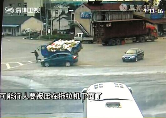 这时,货车与轿车尾部发生碰撞,并形成一个夹角,且货车发生必然的倾斜,右侧前后车轮都离开了地面,眼看就要往左侧翻倒下去,而预备穿过马路的男子正处于两车夹击中心。
