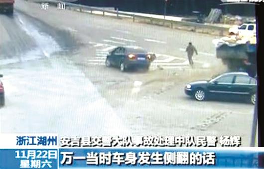浙江安吉交警说:“等我们赶到现场后,这名男子已经离开了现场,后来调看监控视频,我们才发现这一幕奇迹,实在是太神奇了,一般人反应没这么快,十之八九就可能被撞了。”